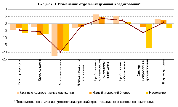 Смягчение условий кредитных договоров сопровождалось сохранением жесткой политики отбора заемщиков, а в ряде случаев — ее дальнейшим ужесточением. Спектр направлений кредитования, сузившийся во II квартале, расширялся лишь по операциям с физическими лицами; на остальных сегментах рынка он оставался почти неизменным. Российские банки продолжали ужесточать требования к финансовому состоянию заемщиков и к качеству обеспечения кредитов, хотя степень этого ужесточения была значительно меньше, чем в предшествующем квартале.