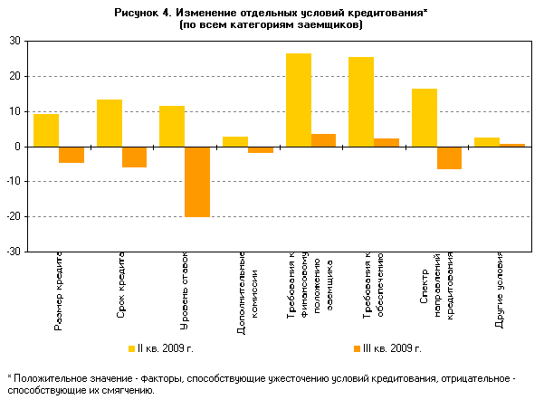 Неценовые условия кредитования, заметно ужесточившиеся во II квартале, в III квартале несколько смягчились. От 15 до 25% обследованных банков увеличили максимальный срок кредитования и предельную сумму кредита для всех трех категорий заемщиков. Подавляющее большинство оставшихся банков оставило эти условия неизменными.