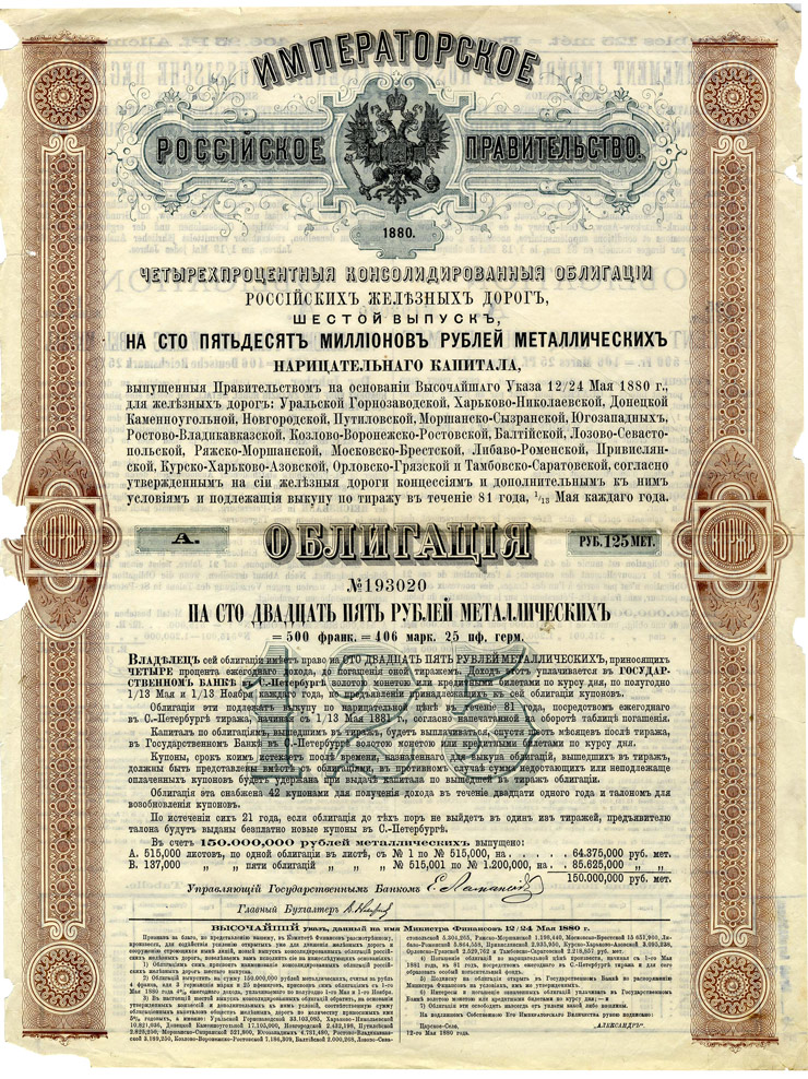 4-ая консолидированная облигация российских железных дорог в 125 рублей «металлических» (с факсимиле подписи управляющего Государственным банком Е.И. Ламанского). 1880 год