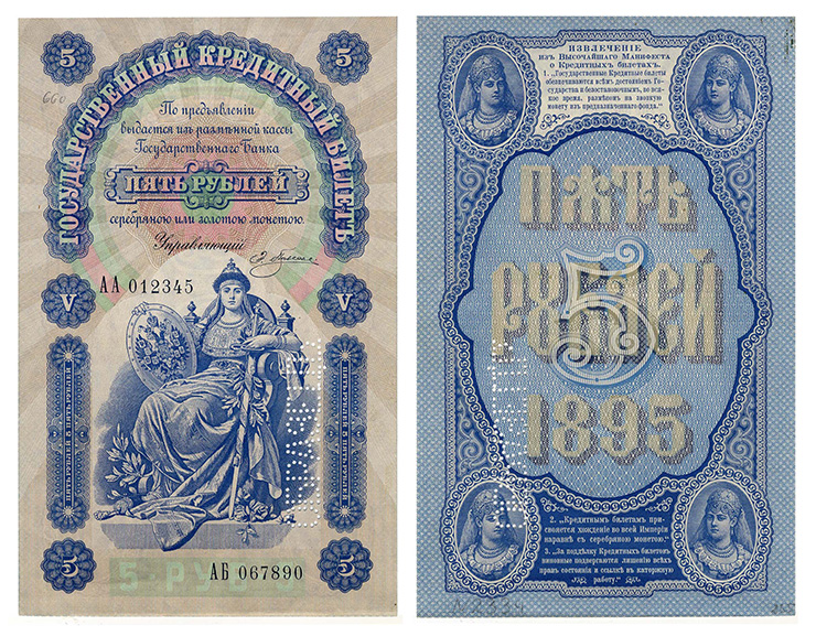 Государственный кредитный билет пять рублей (с факсимиле подписи управляющего Государственным банком Э.Д. Плеске). 1895 год. Образец