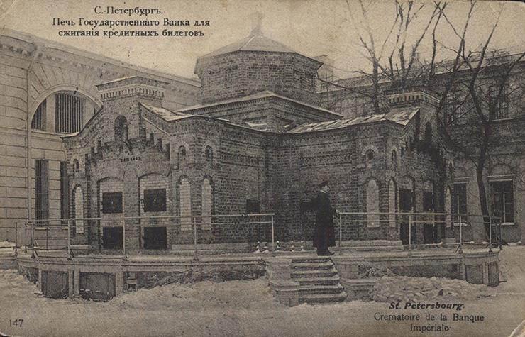 Печь для сжигания ветхих кредитных билетов во дворе здания Государственного банка (в Санкт-Петербурге). Открытка начала ХХ века.