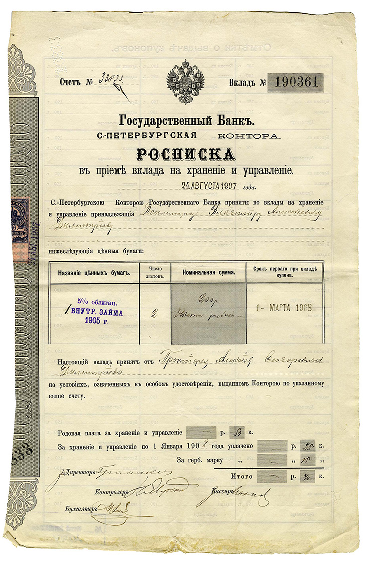 Расписка в приеме вклада на хранение и управление Санкт-Петербургской конторой Государственного банка. 1907 год