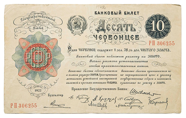 Билет Государственного банка РСФСР 10 червонцев образца 1922 года (с факсимиле подписей Председателя Правления банка А.Л. Шейнмана и членов Правления)