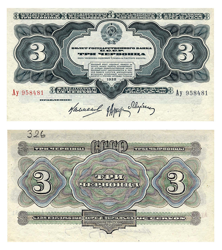 Билет Государственного банка СССР 3 червонца образца 1932 года (с факсимиле подписей Председателя Правления банка М.И. Калмановича, членов Правления Г.М. Аркуса и Л.Е. Марьясина)