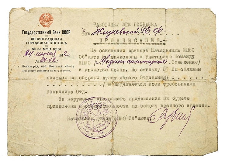 Предписание работнику Ленинградской городской конторы Госбанка СССР. 1942 год