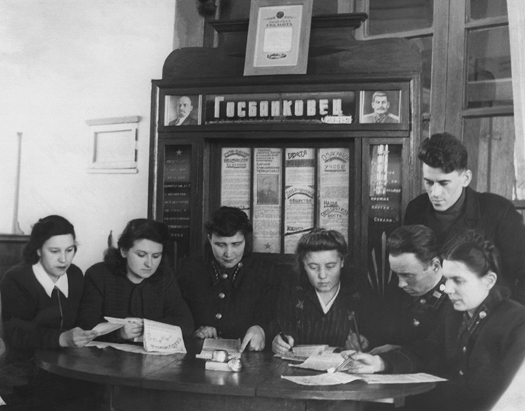 Сотрудники Смоленской областной конторы Госбанка СССР готовят к выпуску номер стенгазеты. Фото. Около 1948 года