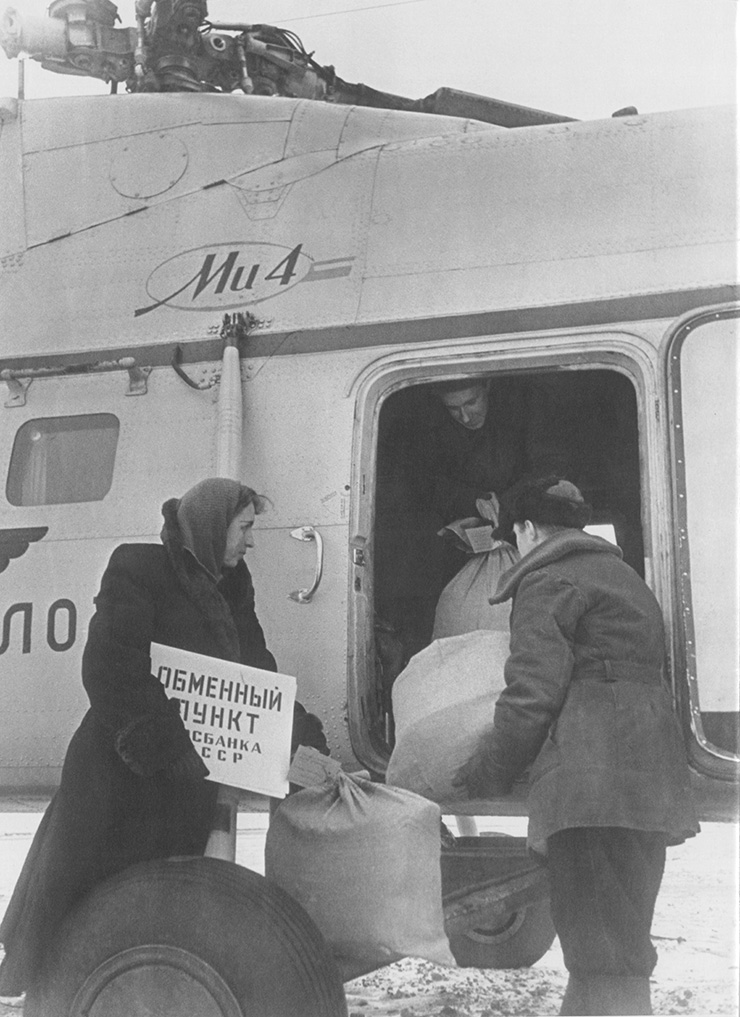 Экономист Архангельской областной конторы Госбанка СССР отправляется в Северодвинск на вертолете для обмена денег на новые, образца 1961 года. Фото. 1961 год