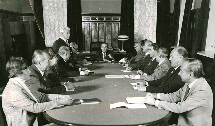 Заседание Правления Госбанка СССР (в центре — Председатель Правления В.С. Алхимов). Фото. Около 1980 года