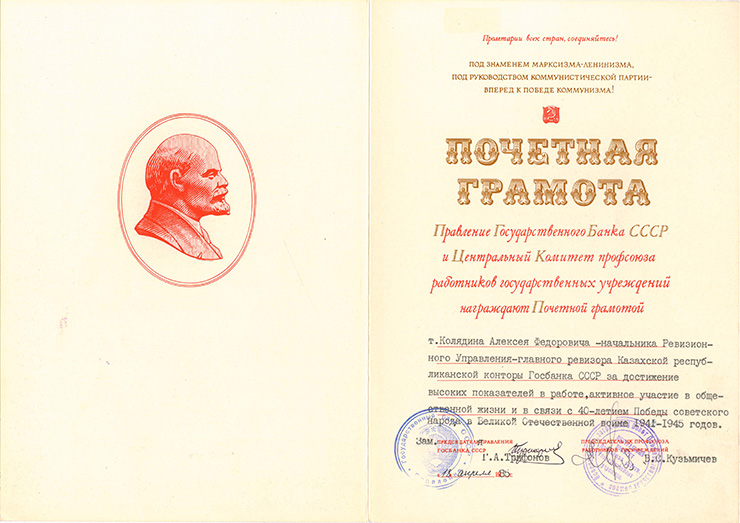 Почетная грамота Правления Госбанка СССР и Центрального Комитета профсоюза работников государственных учреждений. 1985 год