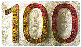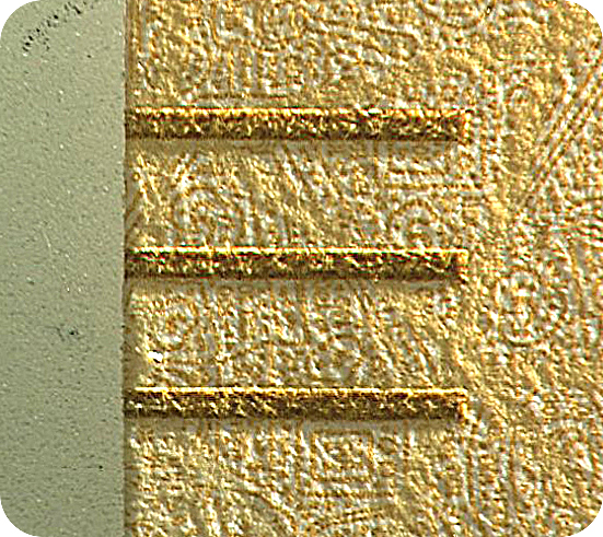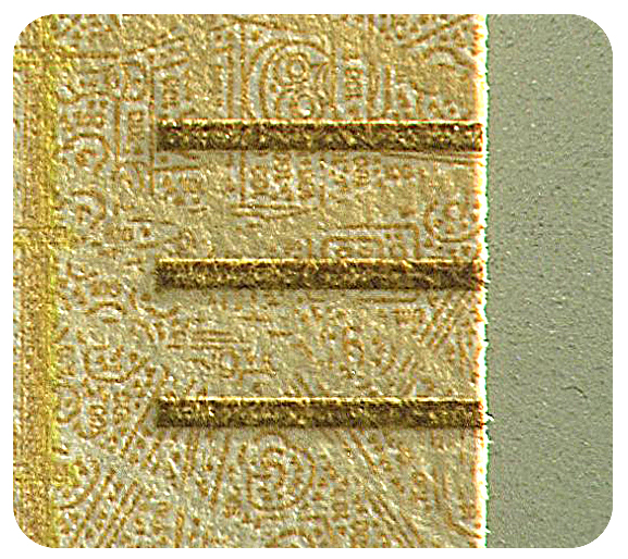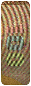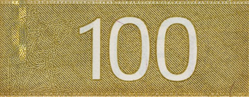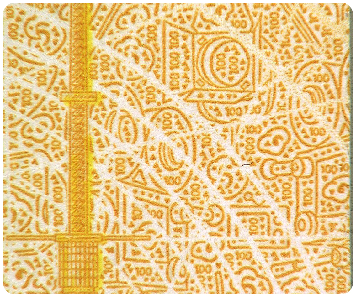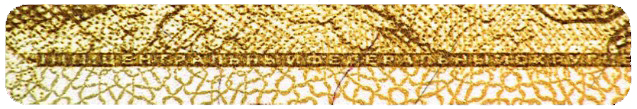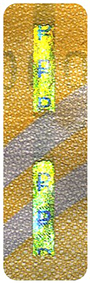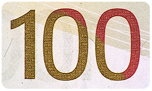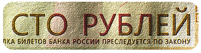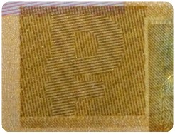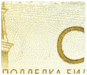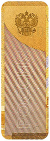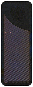 Четыре фрагмента ныряющей голографической защитной нити шириной 2 мм выходят на поверхность лицевой стороны банкноты.