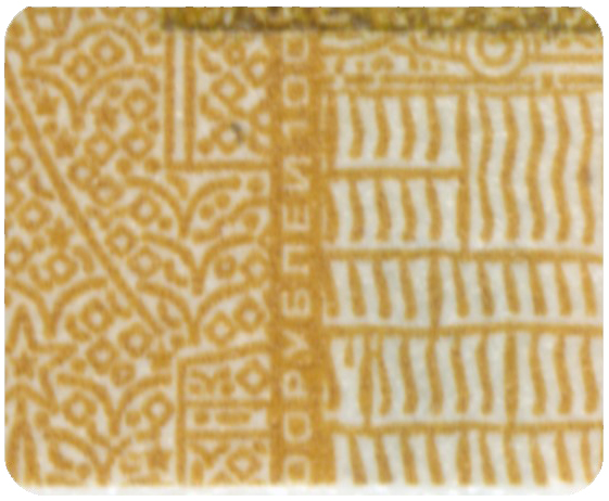 В бумагу внедрены защитные волокна двух типов — цветные с чередующимися участками красного и синего цветов и волокна серого цвета.