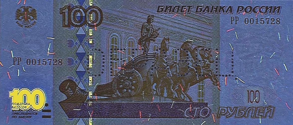 защитной нити видны повторяющиеся сочетания букв и цифр «ЦБР 100», имеющие