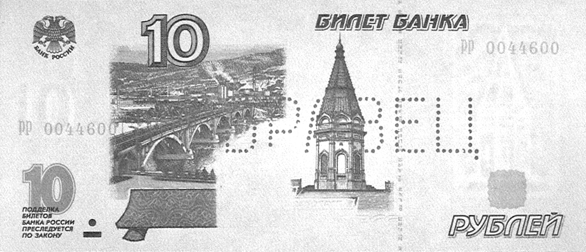 на защитной нити видны повторяющиеся сочетания букв и цифр «ЦБР 10»,