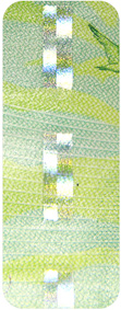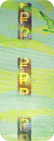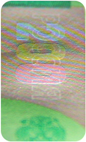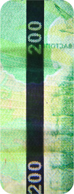 Четыре фрагмента ныряющей голографической защитной нити шириной 3 мм выходят на поверхность лицевой стороны банкноты.