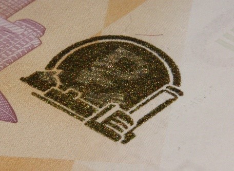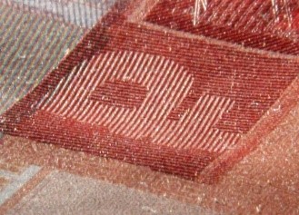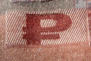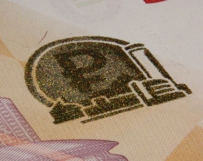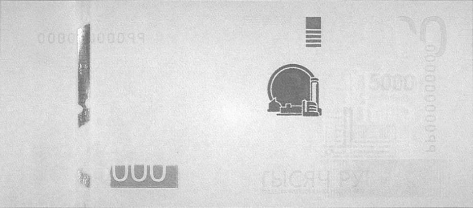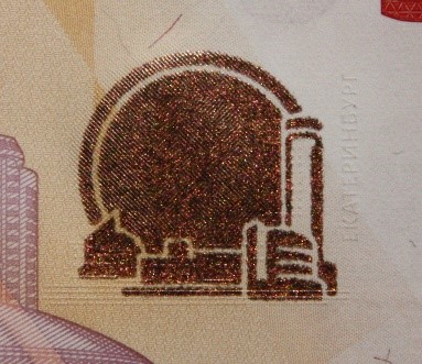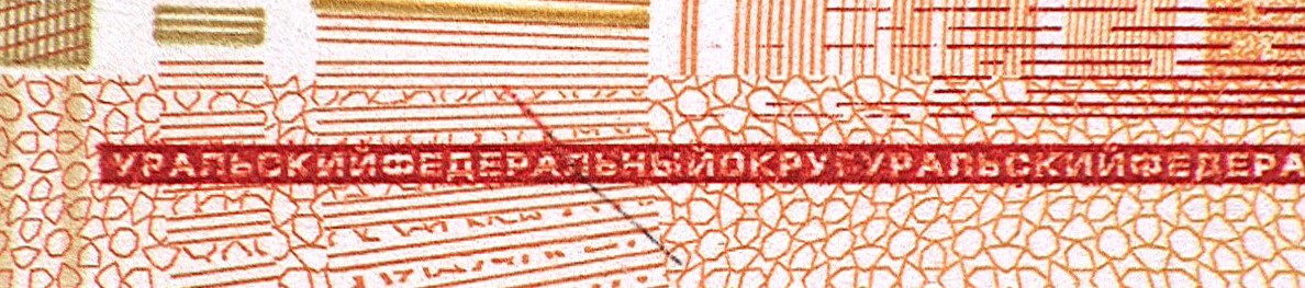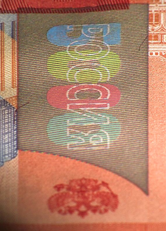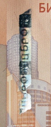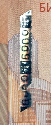 Голографическая защитная нить шириной 5,5 мм выходит на поверхность лицевой стороны банкноты в окне фигурной формы.