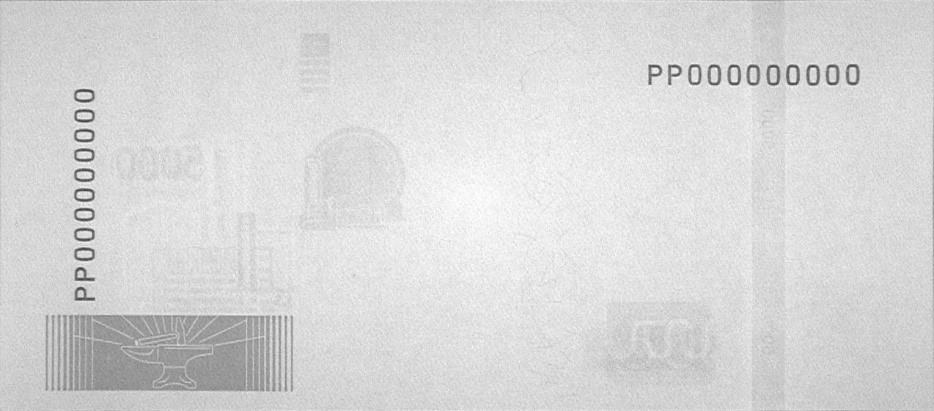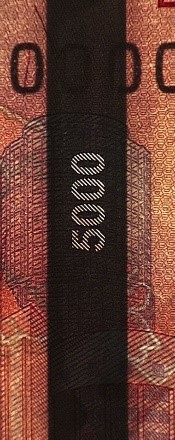 Банкнота имеет два серийных номера, расположенных на оборотной стороне и включающих двухбуквенное обозначение серии и девять цифр номера. Левый номер имеет читаемость по короткой стороне банкноты, правый — по длинной стороне.
