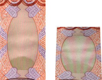 бумаги на лицевой стороне банкноты в окне фигурной формы, видны повторяющиеся