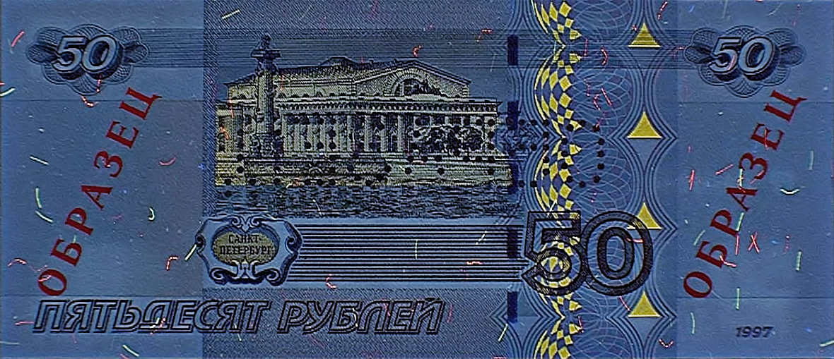 С помощью лупы на оборотной стороне можно различить микротекст. В верхней части банкнот находится позитивный микротекст, сформированный повторяющимся числом 50. В нижней части банкнот расположен негативный микротекст в виде темных полос со светлым повторяющимся текстом «ЦБР50».