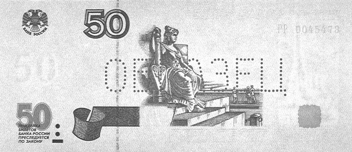 защитной нити видны повторяющиеся сочетания букв и цифр «ЦБР 50», имеющие