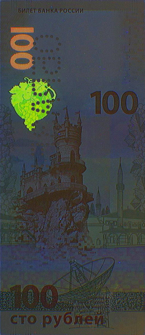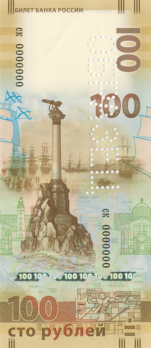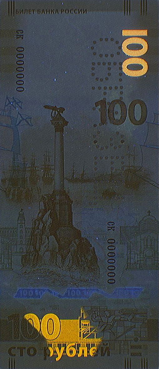 На фрагментах защитной нити, выходящей на поверхность в окне фигурной формы на стороне банкноты, посвященной Севастополю, видны повторяющиеся изображения чисел «100». При изменении угла зрения наблюдается смещение цифр друг относительно друга.