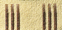 В бумагу внедрена защитная нить шириной 5 мм. При наблюдении на просвет нить выглядит как темная полоса со светлыми повторяющимися изображениями символа рубля на ней, выполненными микродеметаллизацией.