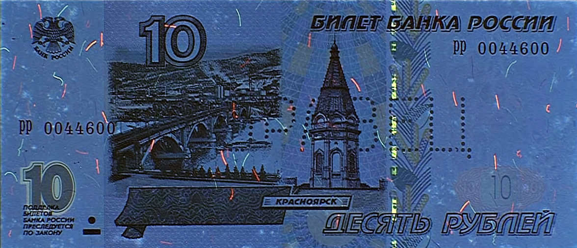 The front of the banknote depicts the bridge across the Yenisey river and a chapel in Krasnoyarsk.