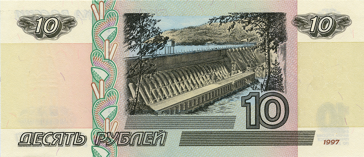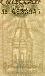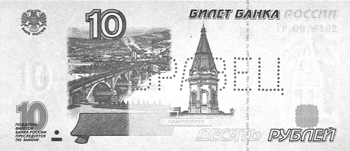 The paper has local watermarks on the left and right coupon fields. In the wide coupon field there is a chapel in the city of Krasnoyarsk and in the narrow coupon field there is a numeric value of the denomination (value numeral 10). When the banknote is held up to the light you can see various parts of the watermarks, some of which are lighter while others are darker than the surrounding paper.