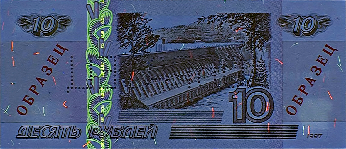 In the top part of the banknote there is a positive microtext in the form of seventeen lines of repeated value numeral „10”. At the bottom of the banknote there is a negative microtext in the form of ten stripes with a repeated text „ЦБР10”.