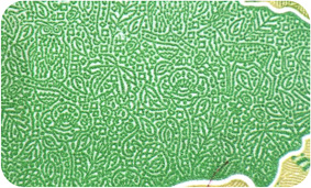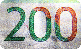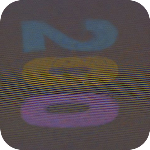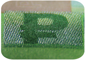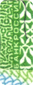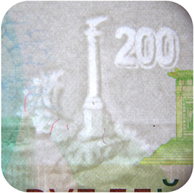 The banknote paper contains two types of security fibres: coloured, with alternate sections of red and blue, and grey ones.