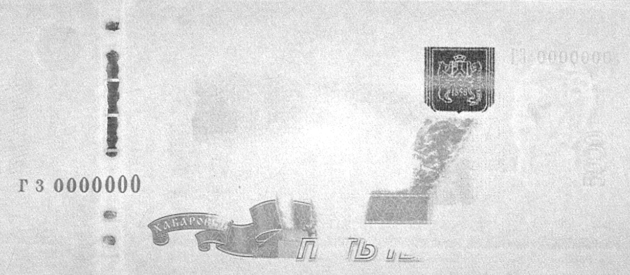 A bright glossy horizontal bar in the middle of the coat-of-arms of the city of Khabarovsk can be seen at the right angle. When the banknote is tilted, dynamic up-and-down move is clearly visible on the coat-of-arms. Simultaneously, the effect of a color change from blue to green is observed.