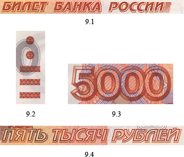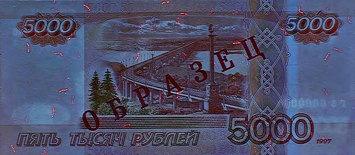 At the bottom of the banknote there is a microtext in the form of seven stripes with a repeated text „ЦБРФ5000” which smoothly changes from negative to positive from the left to the right.