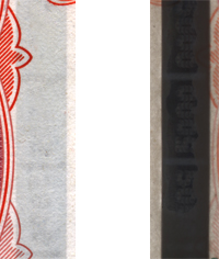 On the back of the banknote the security thread looks like a grey opaque stripe. When the banknote is held up to the light the security thread looks like a dark stripe.