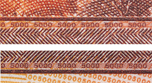When the banknote is held up to the source of light, one can view the note denomination „5000” formed by absolutely straight parallel rows of holes perforated in the paper. The area of a banknote with the holes does not feel rough to the touch.
