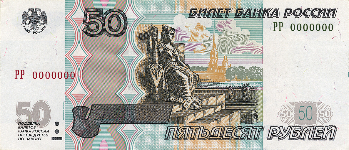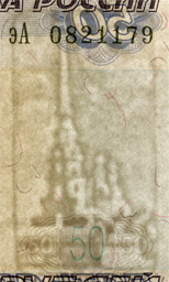 repeated value numeral “50”. At the bottom of the banknote there is a negative