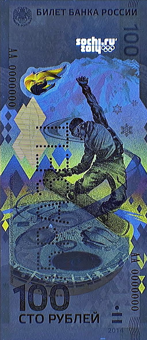 The front of the note features a snowboarder and some of the Olympic venues of the Sochi coastal cluster.
