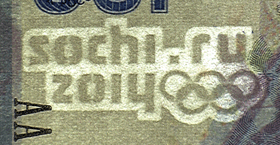 The microtext printed below the Sochi Marine Passenger Terminal on the back of the note, shows the numeral “100” printed repeatedly in a line.