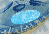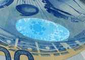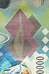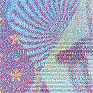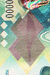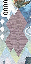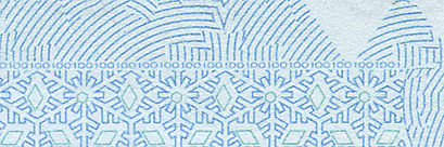 The transparent polymer security stripe, 15 mm wide, is embedded into the banknote paper. Thanks to the polymer stripe, with no paper in its centre, an oval-shaped transparent window appears in the lower part of the note. When held up to the light, a snowflake with the surrounding window frost pattern becomes visible. When viewed from a certain angle, the snowflake appears light against a dark blue background or dark blue against a light background.