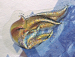 When the note is tilted the bird’s colour changes gradually from golden to green, while the bird’s plumage shifts from negative to positive.